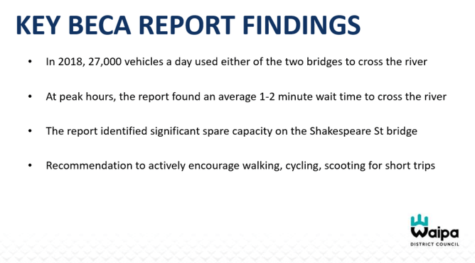 In 2018, Council commissioned independent experts (Beca) to assess the need for a third traffic bridge. The Beca report* found: