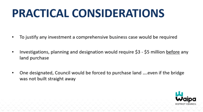 There are potentially alternative options in regards to timing, costs, placement of the bridge and so whilst the conversation has opened, advocacy will follow and more information will be forthcoming.