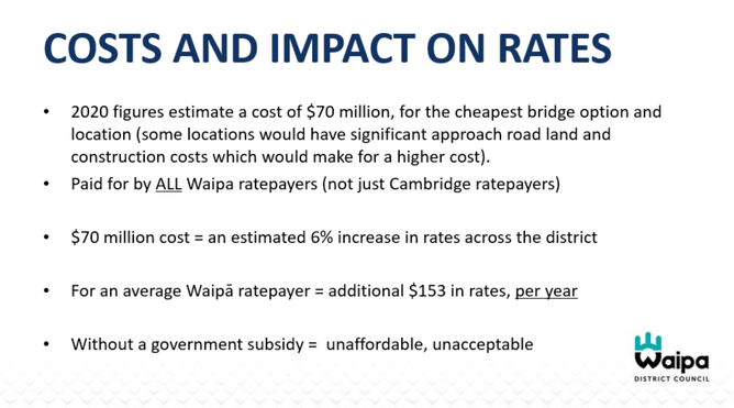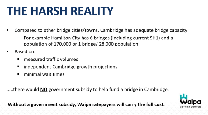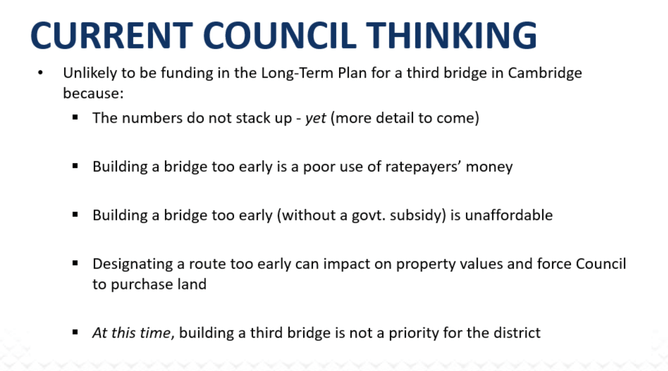 Dawn further presented the council’s position that they is unlikely to be funding in the Long-Term Plan for a third bridge in Cambridge because:The numbers do not stack up - yet