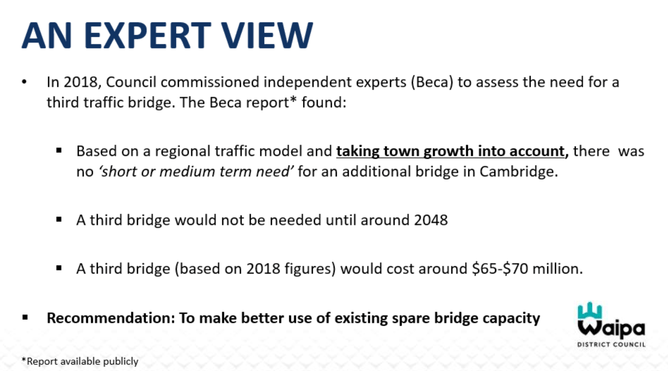 Dawn Inglis Group Manager Service Delivery, for Waipa District Council presented a summary of the Beca report, along with an overview of the Council's current position on the proposition of a third bridge for Cambridge.