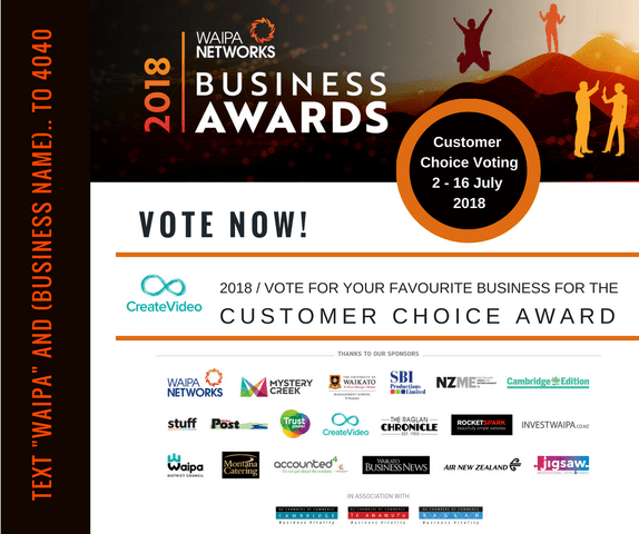Simply text “Waipa” and the “business name” you would like to vote for to 4040 and you will automatically be entered into the draw to win an amazing video photo montage of your choice by Create Video.