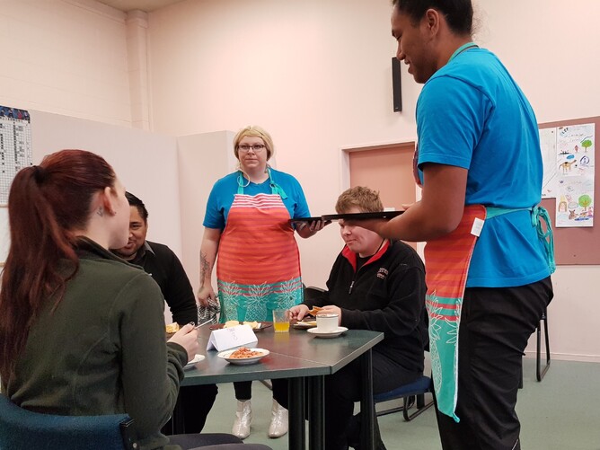 Taking turns at being customers, the group serves coffee and lunch to each other in the 'cafe'.
