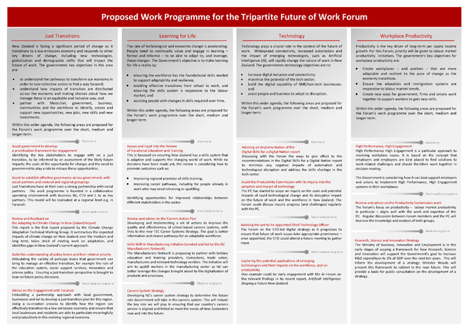 The Forum is a partnership between Government, business (represented by Business NZ) and workers (represented by the Council of Trade Unions). It was set up to shape the Government’s work supporting New Zealand workers and businesses to confidently face the rapidly changing nature of work.