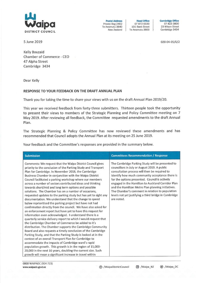 We recently produced a submission to the Waipa District Council on the draft Annual Plan 2019/20