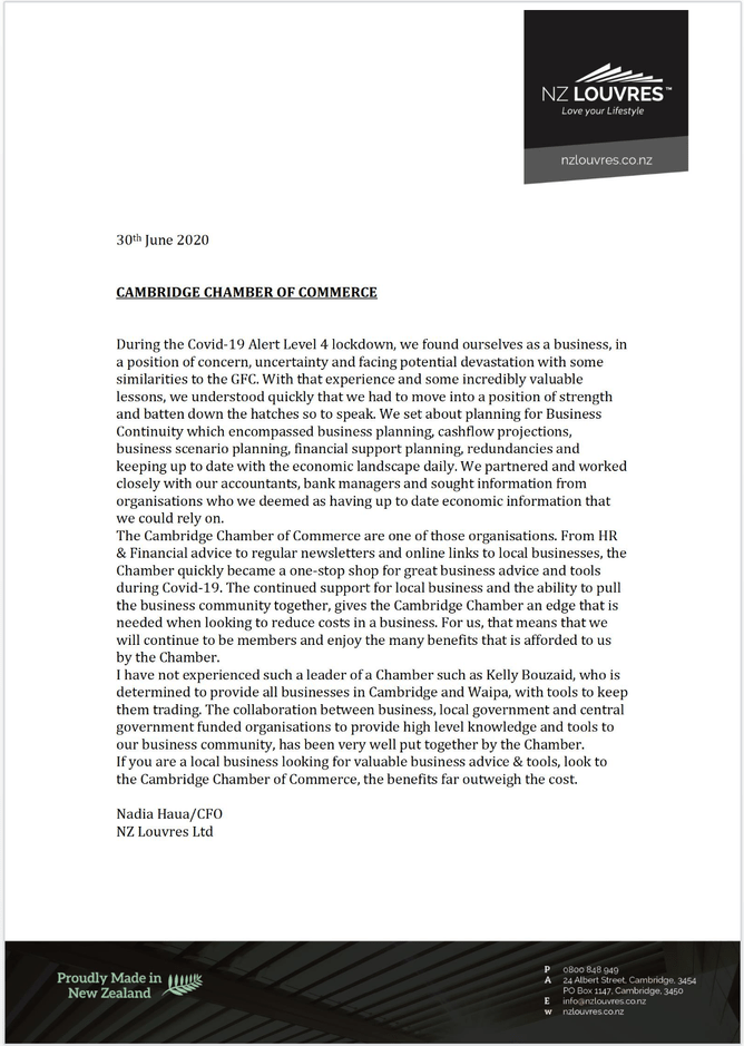 Thank you to Chamber Members New Zealand Louvres, for this wonderful testimonial to the work of the Chamber.