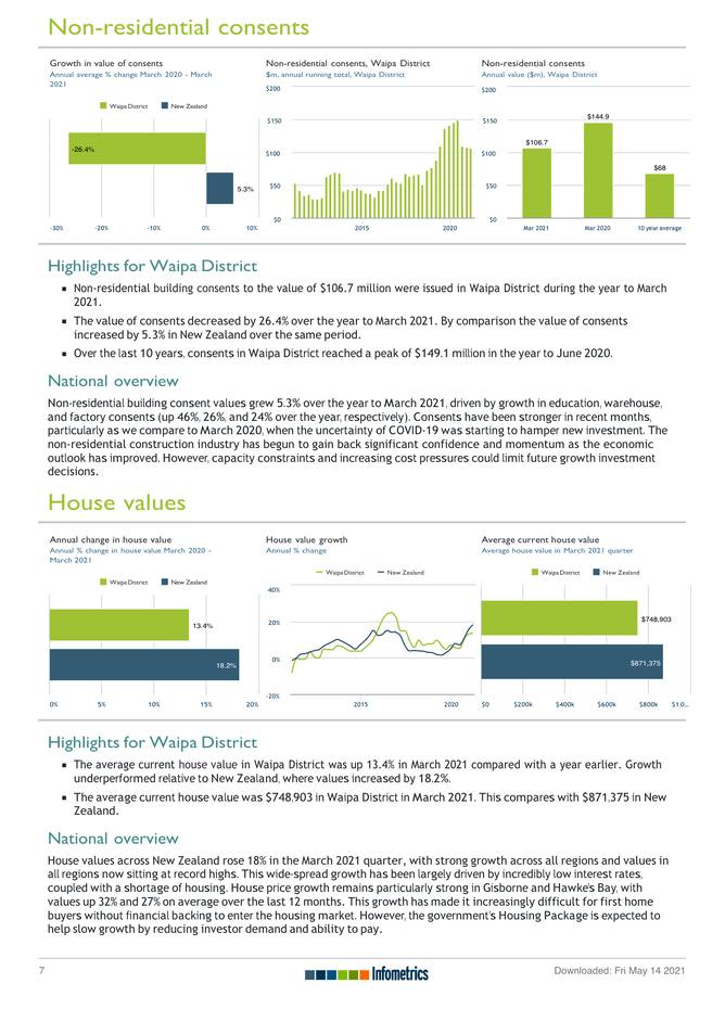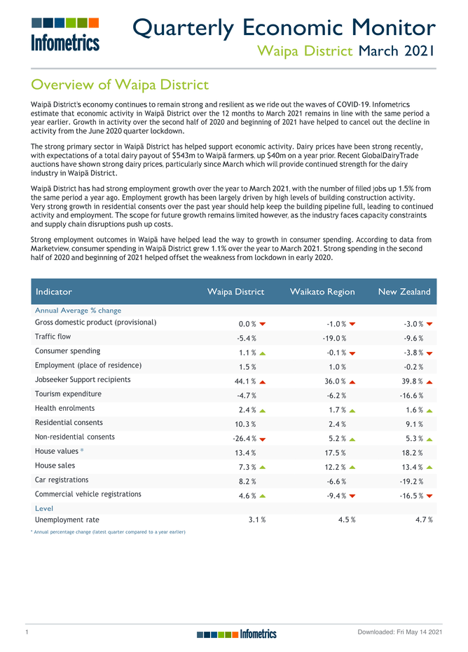 Economic activity indicators in Waipa continue to improve further, with recent March 2021 quarter data from Infometrics showing a further improvement in economic activity, with Waipā’s economy sitting 0.1% below Q1 2020 levels (compared to a 0.3% national decline), taking annual activity to