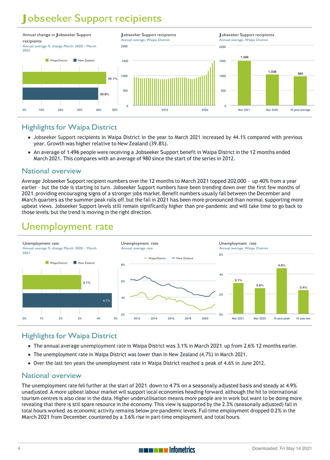 Waipā’s quarterly unemployment rate was estimated at 3.7% by Infometrics in the March 2021 quarter, taking the annual average unemployment rate to 3.1%, compared to a 4.7% average across New Zealand over the last year. Although annual average Jobseeker Support recipients are still rising,